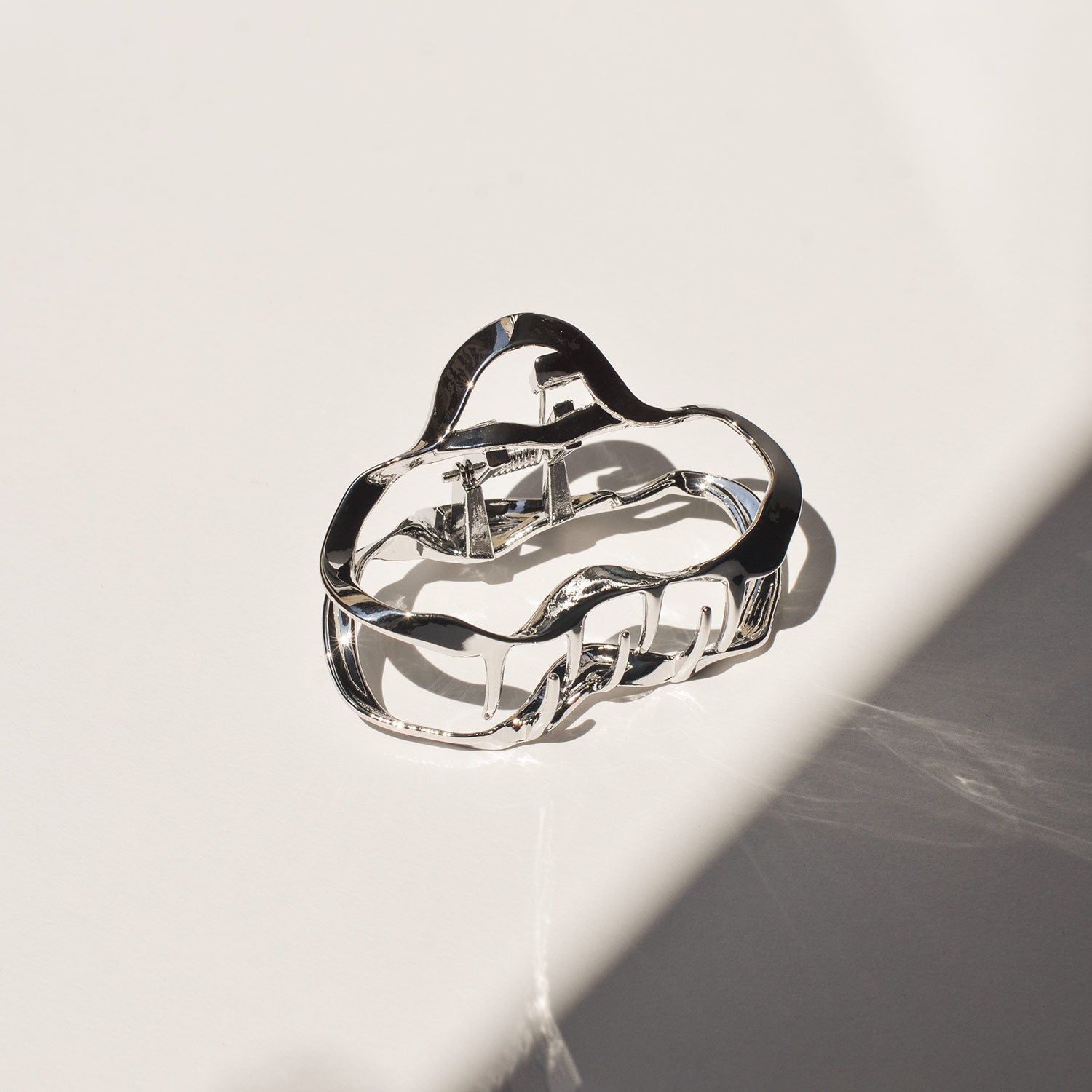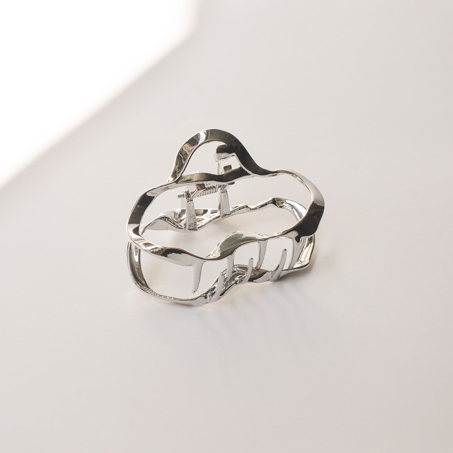 - Wave Shape Hair Claw Clip with a smooth, polished silver finish.